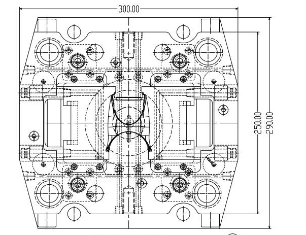 根据注塑机的能力,设计1出1的模具结构,模具设计图见图2,日精DC120T双色注塑机的码模位置见图3,选定非标模胚DDI2530,为了适合机器的旋转,特将模胚的角部做了大的倒角。设计双色模具时,模胚的大小一定不能超出机器允许的码模范围。